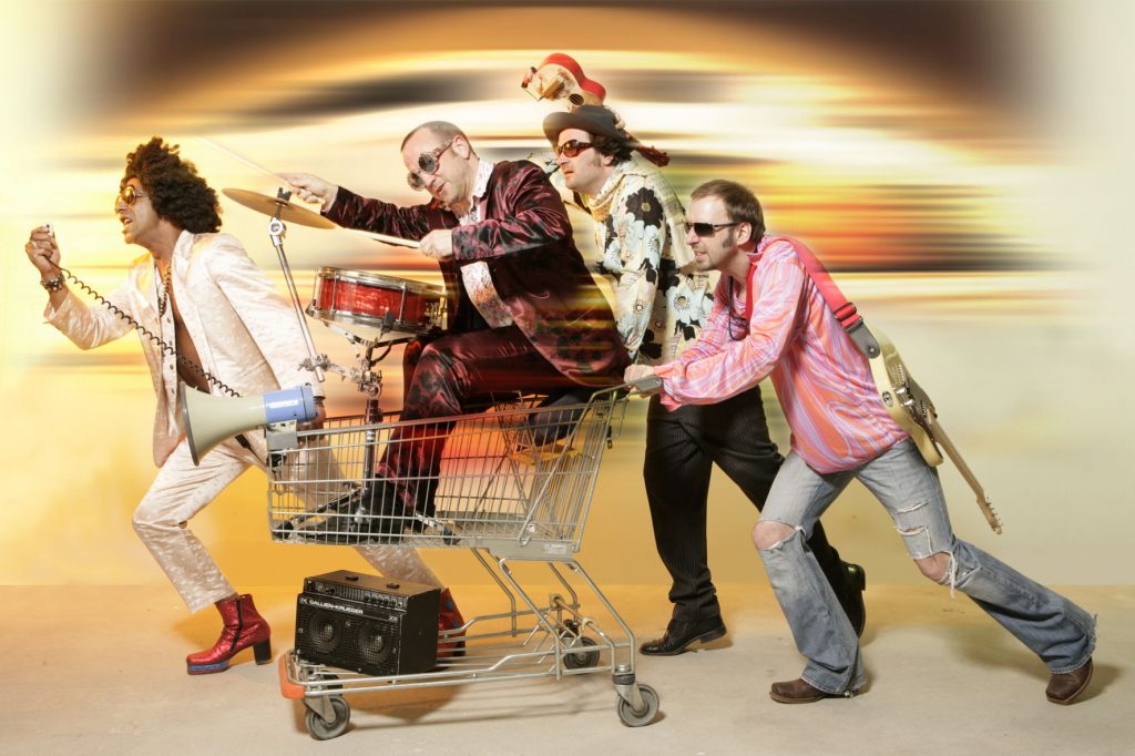 Alles im Einkaufswagen – Schlagzeug, Beschallung, Stromversorgung und Elvis. Ob auf oder vor der Bühne, im Fahrstuhl oder in der Strassenbahn, auf oder unter der Strasse – James Brown goes comedy, Andre Rieu goes Earth, Wind & Fire. Eben „voll funk“.